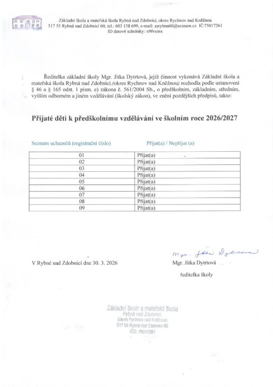 přijaté děti k předškolnímu vzdělání 2026 / 2027